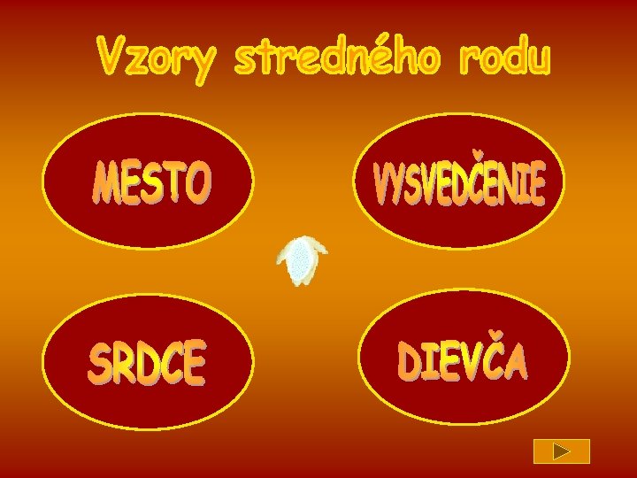 Vzory stredného rodu vysvedčenie dievča mesto srdce vysvedčenie OVOCIE VNÚČA VAJCE BÁB AUTO LETO LÍCE Ä srdce Klikni na tlačidlo, vyber správny vzor 1. dievča 2. 3. srdce mesto 4. 5. Spočítaj slniečka! vysvedčenie srdce dievča 6. 7. HODNOTENIE