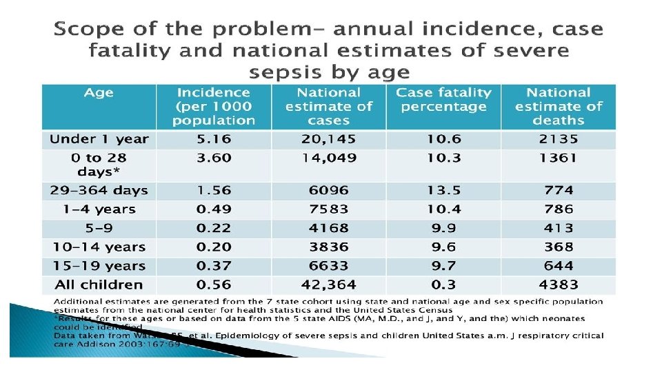 Background • A significant public health burden and a leading cause of morbidity and mortality among infants and children across the world • Prevalence of pediatric severe sepsis has increased from 6. 2% to 7. 7% over the past decade • Mortality has decreased over time‐ continues to be high‐ estimated to be 9% for all‐cause mortality, and as high as 25% for those patients admitted to the intensive care unit (ICU) • Among sepsis survivors, approximately one‐fifth have at least moderate disability; long‐term physical, psychological, and cognitive disabilities • Pediatric sepsis is also associated with significant resource utilization and accounts for $4. 8 billion in healthcare costs in the United States