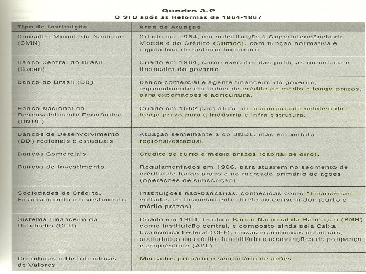 PAEG - Plano de Ação Econômica do Governo • Reforma financeira: objetivo dotar do SFB de mecanismos de financiamento não inflacionários, ↑ eficiência e ↑ poupança. • criação do Banco Central e Conselho Monetário Nacional executar a política monetária (restringir a expansão dos meios de pagamento) → proteger os ativos da inflação (modelo norteamericano) • i) criação de mecanismos de correção monetária a ORTN para financiamento do déficit público (não inflacionário) e correção monetária para títulos privados - indexação • ii) ampliação do grau de abertura ao capital externo (IDE): facilitação da contratação de empréstimos externos pelas empresas nacionais, bancos (resolução 63 do Bacen) e facilitação da remessa de lucros • iii) criação do SFH e do BNH