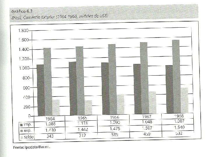 Milagre • Pode contar com a expansão monetária (14% no Milagre, contra 5%) – crédito ao setor privado • Trade off da Curva de Pillips – fatores de contenção da inflação: ü capacidade ociosa ü Controle sobre preços e juros ü Política salarial ü Politica agrícola • Dilema entre crescimento e equilíbrio externo (Gianbiagi, p. 87) ü Disponibilidade de liquidez internacional + simpatia dos EUA ü Melhora dos termos de troca ü Expansão do comercio mundial