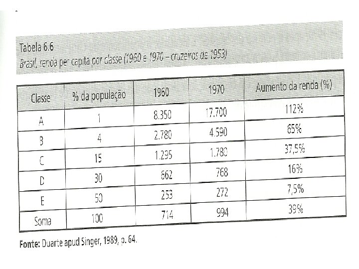 Milagre • Aprofundamento da estratégia de desenvolvimento associado e dependente que caracteriza a era Vargas, com a diferença profunda de que o Milagre reforçou a liderança no setor de bens de consumo mantendo a dependência tecnológica e acentuado desequilíbrio setorial: ü Descompasso entre o crescimentos diversos setores, bens de capital a reboque dos demais, demais bens leves e agricultura com desempenhos modestos: gargalos na oferta + pressões inflacionárias ü salário mínimo no período 1964 -1967 42%, sendo durante o PAEG -25, 2% e durante o Milagre -15, 1% ü 1972 - 50% dos assalariados recebiam até 1 sm; 22% entre 1 e 2 SMS e 75, 3% até 2 sms ü salário do pessoal ocupado na produção 10% (1964 -74), enquanto os mais qualificados 6, 3% (1964 -72).