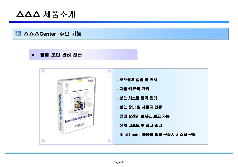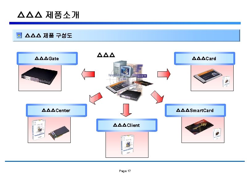 △△△ 제품소개 △△△Gate 기본 Concept △△△Gate VPN Firewall Contents Filtering Application Qos Load Balancing NAT & PAT Black Zone Server 유해사이트 차단 안티바이러스 NIDS 메일검색 트래픽 분석 △△△Center Data. Base Center Engine • 중앙 집중식 관리 • Client/Server 모델 • 다중 센터 지원 Center Manager Page 16