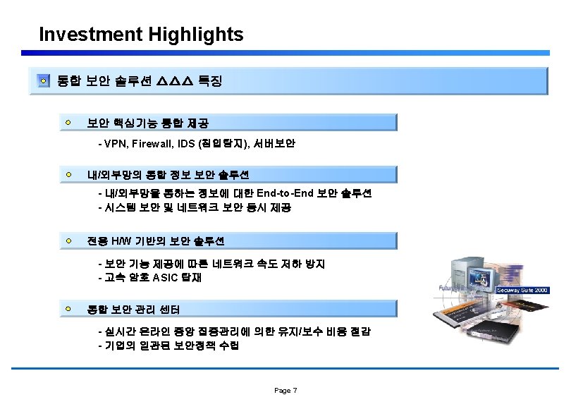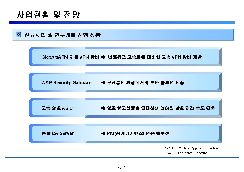 사업현황 및 전망 정보 보안 시장 변화 VPN + Firewall, IDS VPN + Firewall, VPN Firewall 20 XX End-to-End VPN 20 XX Page 27 기능 Integration