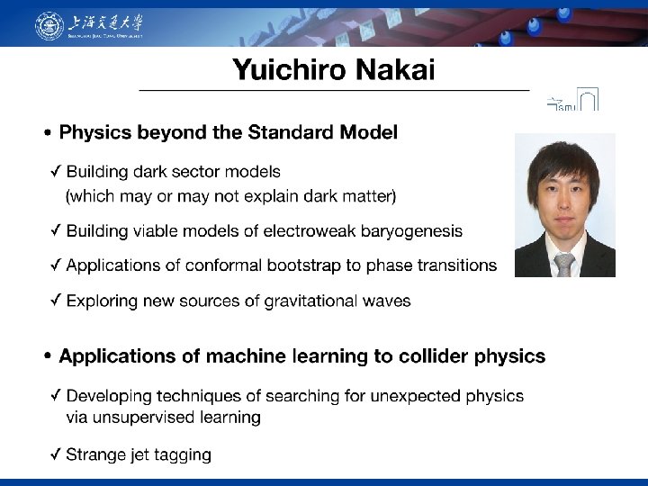 TDLI Fellow/Associate Professor: Jason Evans • First measurement of Goldhaber was anthropic • Proton decay radiates Human body • Supersymmetric Minimal GUT • Couplings unify • Smoking gun signal • Proton decays • Models found with: • Proton Decay long enough • Higgs mass of 125 Ge. V • Dark matter, thermal • Upcoming experimental searches • Juno : • HK : • DUNE: • Alternate GUTs could lead to • dominant decay mode • Flavor violation and CP violation • Visible at ACME II • Different Dark matter candidates