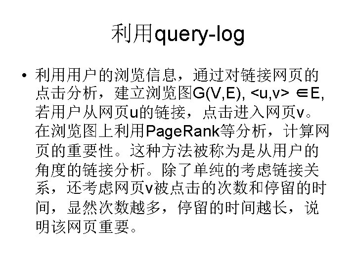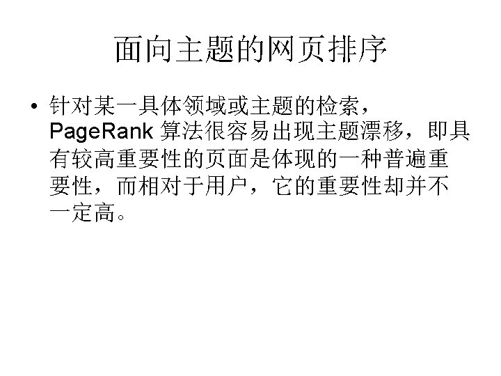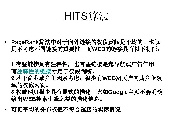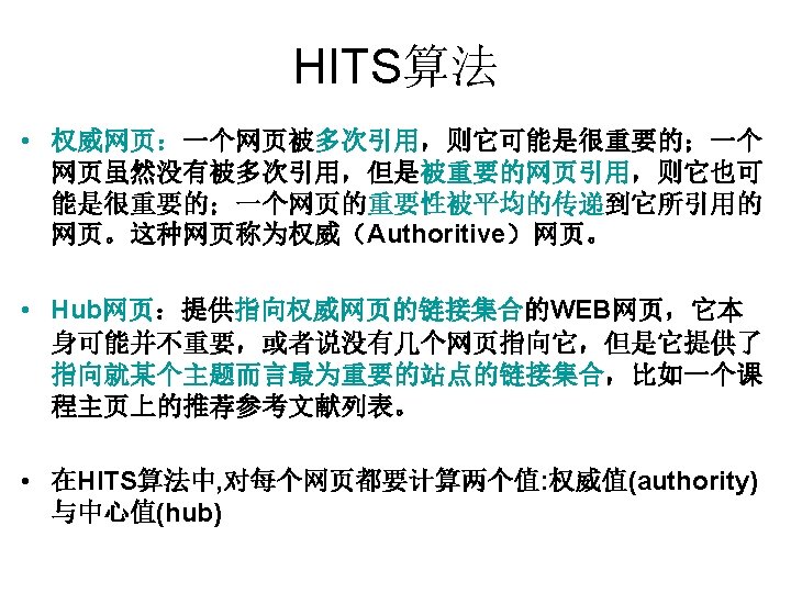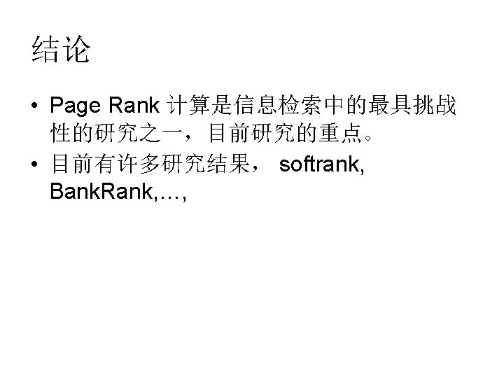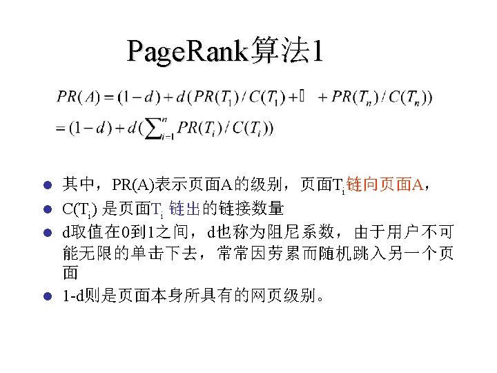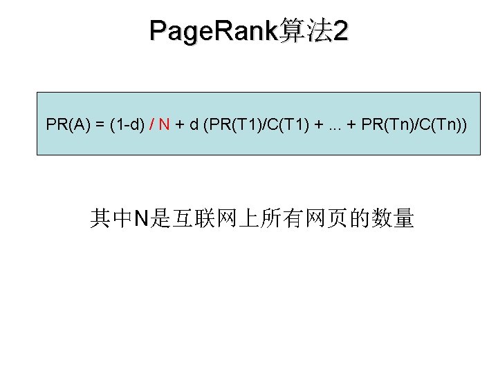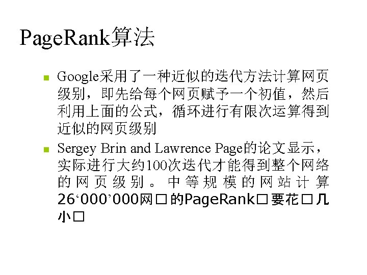 Page Rank 历史 • Sergey Brin和Lawrence Page在 1998年提出了Page. Rank 算法,同年J. Kleinberg提出了HITS算法 • Lawrence Page, Sergey Brin, Rajeev Motwani, Terry Winograd, 'The Page. Rank Citation Ranking: Bringing Order to the Web', 1998, http: //www-db. stanford. edu/~backrub/pageranksub. ps • 为了更高效地计算 Page. Rank, 以下是改良以后的一篇论文。 Taher H. Haveliwala, ‘Efficient Computation of Page. Rank’, Stanford Technical Report, 1999, http: //dbpubs. stanford. edu: 8090/pub/1999 -31 • Page. Rank(TM) 是美国 Google 公司的登记注册商标。