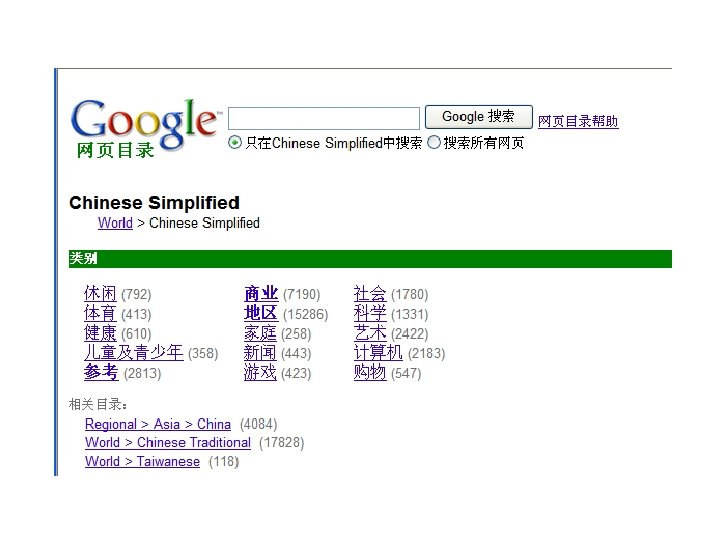 ODP • The Open Directory Project is the largest, most comprehensive human-edited directory of the Web. It is constructed and maintained by a vast, global community of volunteer editors. • The Open Directory provides the means for the Internet to organize itself. As the Internet grows, so do the number of net-citizens. These citizens can each organize a small portion of the web and present it back to the rest of the population, culling out (挑选出)the bad and useless and keeping only the best content.