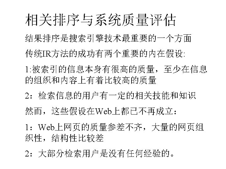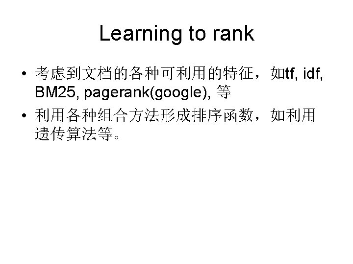 Learning to Rank • In most recent works, learning to rank is defined as having the following two properties: • Feature based; • Discriminative (有识别能力)training. • Automatic parameter tuning for existing ranking models.