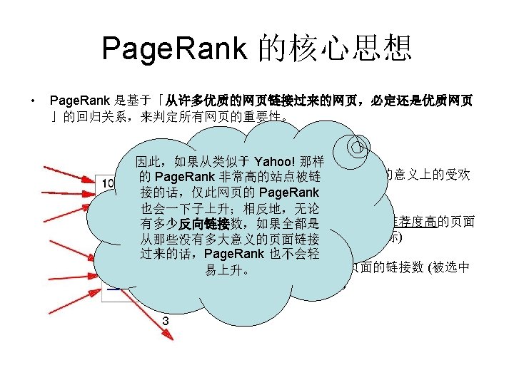 Page. Rank实例 • 流入量 =(ID=2发出的Rank) +(ID=3发出的Rank) +(ID=5发出的Rank) +(ID=6发出的Rank) = 0. 166+0. 141/2+0. 179/4+0. 045/2 = 0. 30375