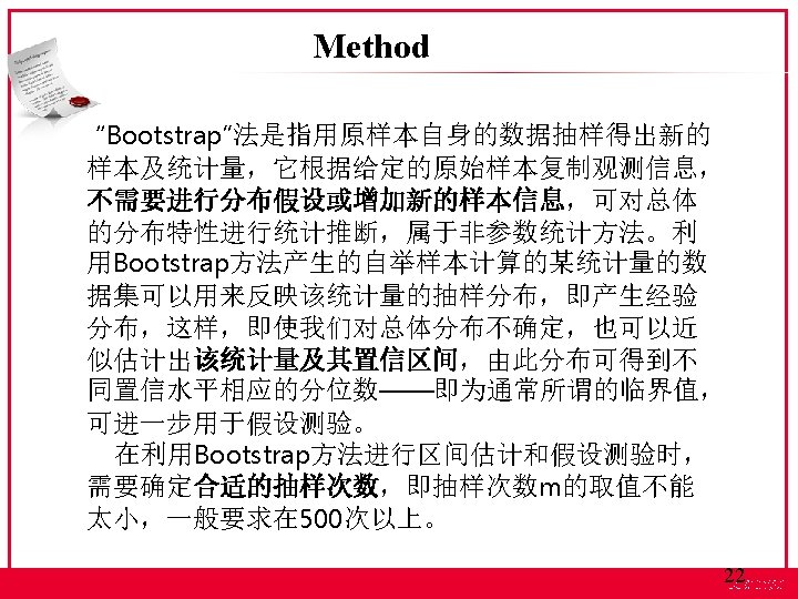 Method l Pain Intensity p a composite measure involving four dimensions (current, worst, least, and average pain) p We used an 11 -point box scale (0 to 10) with color gradation(different shades of red) to measure each item. p Box scales, given that they combine numerical scales and visual analogue scales, are highly appropriate for measuring pain in the elderly 14 MEDICAL