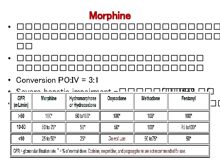 Titration of Morphine for Pain Control • ������ 0. 15 -0. 3 mg/kg PO q 4 h MO naïve ����� 5 mg )max 10 -15 mg) 0. 05 -0. 1 mg/kg IV/SC q 4 h MO naïve ������ 3 mg )max 5 -10 mg) • ���� - 5 mg immediate released MO MO-IR (10 mg) ½ tab or MO syr (2 mg/cc) 2. 5 cc PO q 4 h. - ������� 10 mg controlled release tab (MST) q 8 h. - Break through dose = dose ����� 4 ��. ������ MO ���� 24 h ÷ 6 ����� immediate released