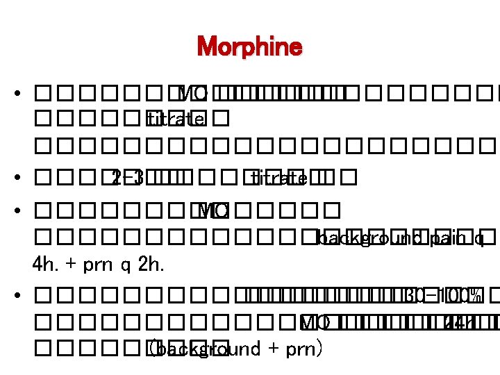 Morphine Preparations & administration: -������ (immediate-released (����� 4 ��. MO syrup (2 mg/ml) Immediate released tablet 10 mg (MO-IR) - ����� (slow-released(: MST (10, 30, 60, 100 mg/tab) q 8 -12 hr. Kapanol (20, 50, 100 mg/cap) q 12 -24 hr.