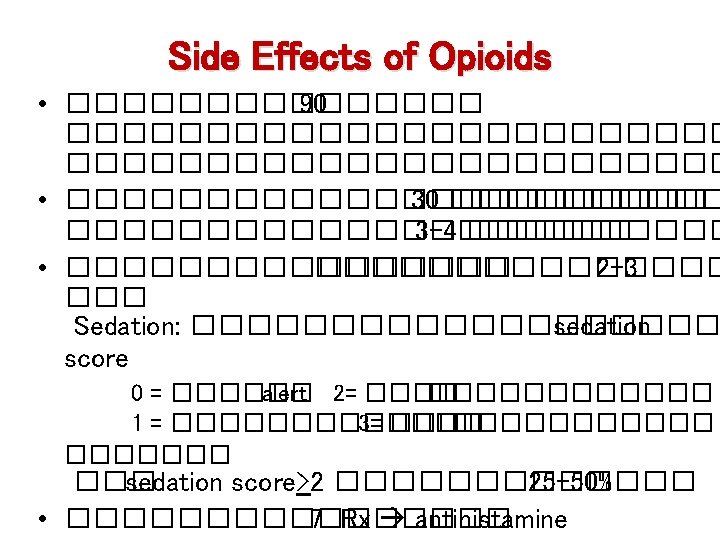 Increasing analgesic response Unconsciousness Apnea Respiratiory depression Increased sedation Increased nausea, vomiting Base - line analgesia Increasing opioid dose