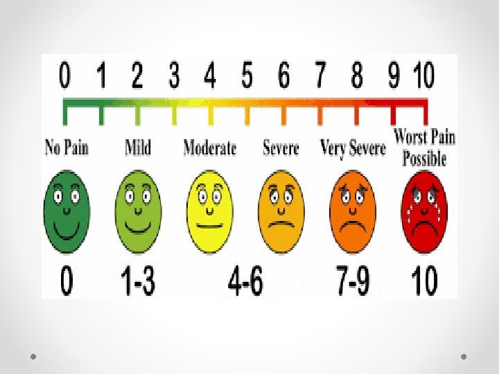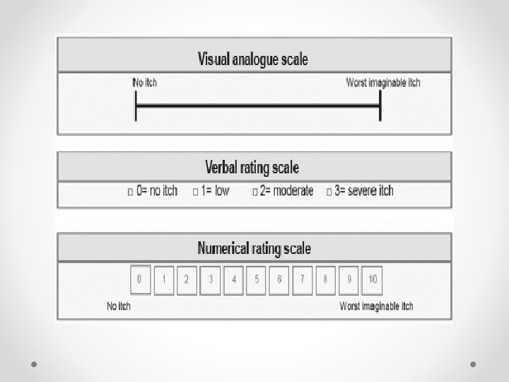 Assessment of intensity of acute pain • The well-known visual analogue scale (VAS) and numeric rating scale (NRS) for assessment of pain intensity agree well and are equally sensitive in assessing acute pain after surgery, and they are both superior to a four-point verbal categorical rating scale (VRS). They function best for the patient’s subjective feeling of the intensity of pain right now—present pain intensity. • They may be used for worst, least, or average pain over the last 24 h