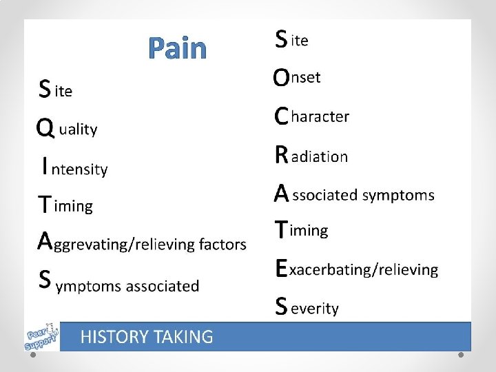 Assessment of chronic pain Where is the pain? (ii) How intense is the pain? (iii) Description of the pain (e. g. burning, aching, stabbing, shooting, throbbing, etc). (iv) How did the pain start? (v) What is the time course of the pain? (vi) What relieves the pain? (vii) What aggravates the pain?
