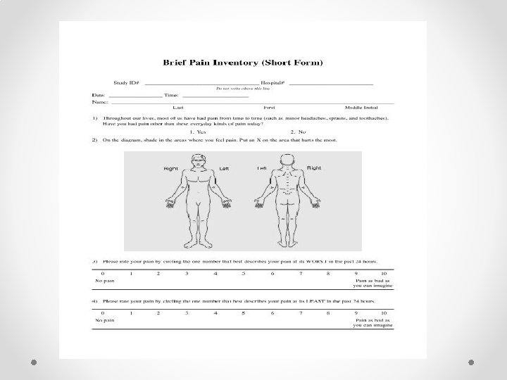 Assessment of chronic pain A- The Brief Pain Inventory (BPI) was developed from the v. Wisconsin Brief Pain Questionnaire. The BPI assesses pain severity and the degree of interference with function, using 0 – 10 NRS. It can be selfadministered, given in a clinical interview, or even administered over the telephone. Most patients can complete the short version of the BPI in 2 or 3 min. Chronic pain usually varies throughout the day and night, and therefore the BPI asks the patient to rate their present pain intensity, ‘pain now’, and pain ‘at its worst’, ‘least’, and ‘average’ over the last 24 h. Location of pain on a body chart and characteristics of the pain are documented. The BPI also asks the patient to rate how much pain interferes with seven aspects of life: (1) general activity, (2) walking, (3) normal work, (4) relations with other people, (5) mood, (6) sleep, and (7) enjoyment of life. The BPI asks the patient to rate the relief they feel from the current pain treatment.