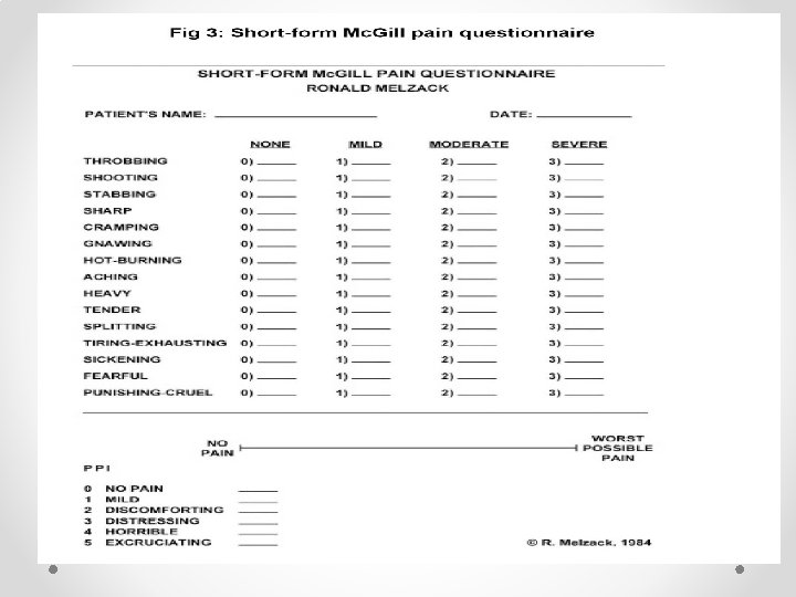 Assessment of chronic pain b-The Mc. Gill Pain Questionnaire and the short-form Mc. Gill Pain Questionnaire: The Mc. Gill Pain Questionnaire (MPQ) and the short-form MPQ (SF-MPQ) evaluate sensory, affective–emotional, evaluative, and temporal aspects of the patient’s pain condition. The SF-MPQ consists of 11 sensory (sharp, shooting, etc. ) and four affective (sickening, fearful, etc. ) verbal descriptors. The patient is asked to rate the intensity of each descriptor on a scale from 0 to 3 (¼severe). Three pain scores are calculated: the sensory, the affective, and the total pain index. Patients also rate their present pain intensity on a 0 – 5 scale and a VAS. 34