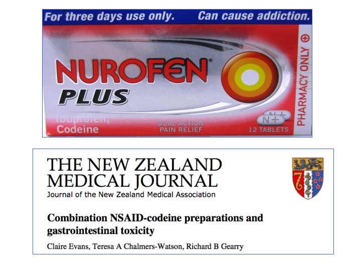 So, what to think about codeine? • Unpredictable pro-drug with no effect in 5 -10% and high effect in 5 -10% • Little evidence of benefit – would not get to market now • Associated with initiating dependency, especially in combination with NSAID as OTC analgesic • May induce tolerance rapidly and prevent stronger opioids working when needed