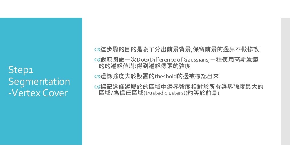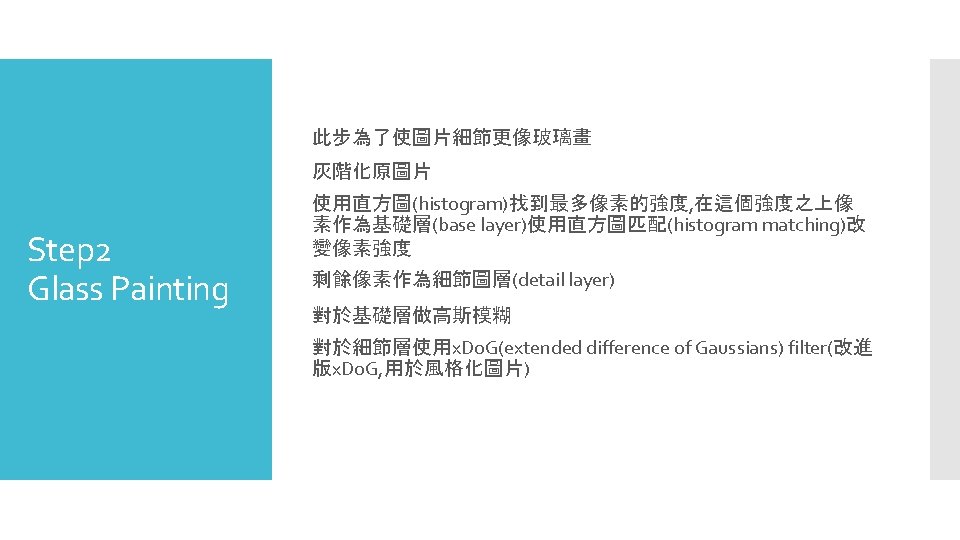 Painted Stained Glass 201963 Step 1 Segmentation Step Slides: 17 Download presentation 論文報告 -Painted Stained Glass 吳戈飛 2019/6/3 Step 1. Segmentation 方法步驟 Step 2. Glass Painting Step 3. Rendering Procedure Step 1 Segmentation -Vertex Cover Step 2 Glass Painting Comparison of our method with Mould 比較 : Comparisons of our method with Brooks Comparison of our method with Setlur on faces. 結語 THANKS FOR WATCHING