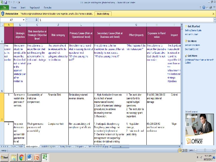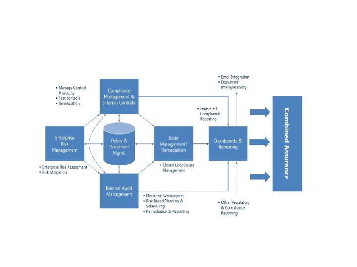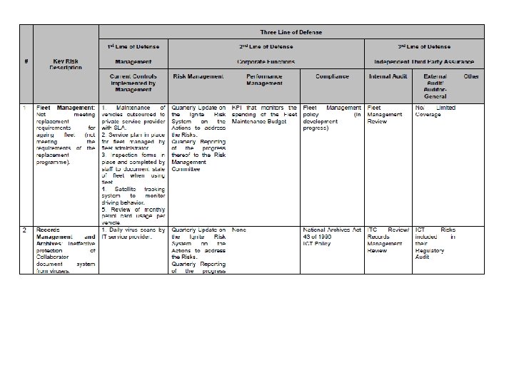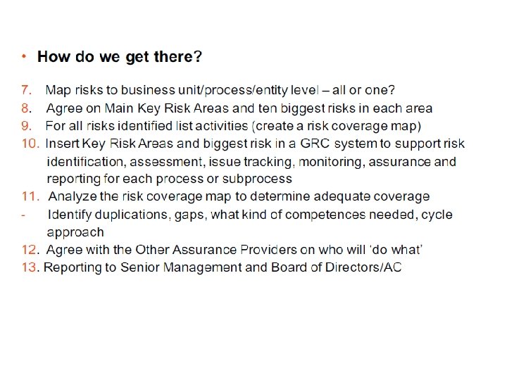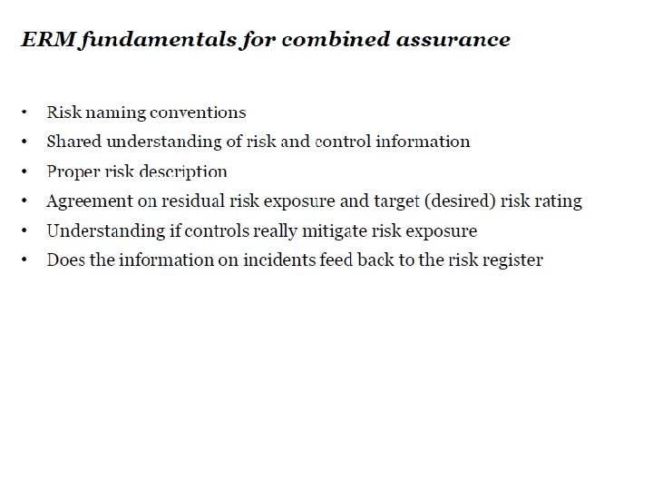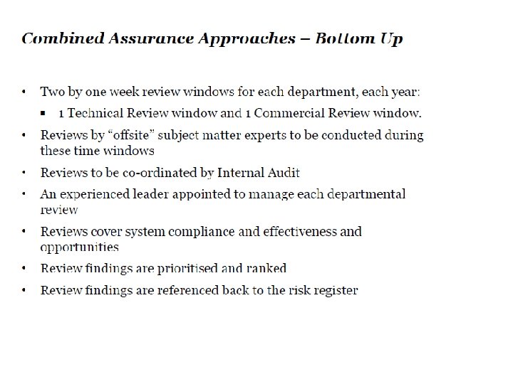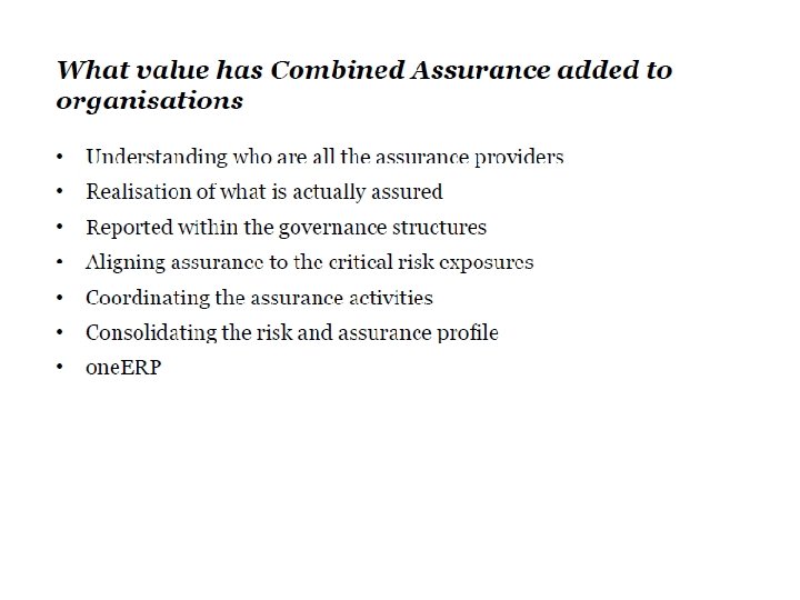 Strengths to build on � A combined assurance approach is mostly already in place – to an extent – which is a good starting point. The approach typically requires some further tweaking and embedding into the day to day business activities. � A three lines of defence assurance model is typically already established, where the first, second and third line assurance providers are already involved in the business with their roles being fairly mature (except perhaps for the management self-assessments). � An ERM framework is mostly already in place. This integrates the business objectives with business processes and key risks. � A Financial control framework and IT governance is often already in place, however not tied into the ERM and expanded to also cover nonfinancial controls, and not necessarily integrated