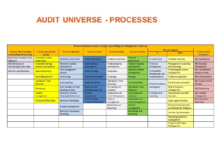 Audit Universe Legislature Provider of Voted funds Providers of other funds Other departments Customer Supplier Stakeholder Competitor Executive Authority Deliverables Legislative Auditor Rian v Niekerk Support Processes Production & Delivery Legislative & Regulatory Budget process New programs/objectives Ethics Economic Reputation Transaction Governance Service Delivery Current programs/objective s Process Other Tangibles Learning Organisation Plant, Property & Estate Human Resources Physical Asset Strategic People & Culture Contract Liability Legal Operations Public Sector Risk Universe Financial Accounting Suspense accounts Financial information Changes to acc. basis Liquidity Requisition of funds Cash Management Revenue fund Cheques and Electronic payments Knowledge Reporting Appropriation Accounting framework Regulatory & Compliance Budget Equitable share Grants Systems Hardware Software Networks Information Management Non financial Reporting Planning & Development Executive Authority Operations Organisation & Monitoring Provincial Treasury Legislature