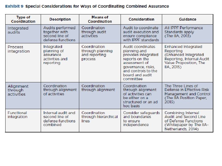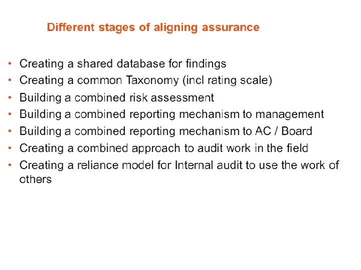 Level of maturity • Assurance provider – delivering objective assurance of the effectiveness of governance, risk and internal control system. • Problem solver – analysis of root causes of findings and making recommendations to correct the findings. • Insight generator – pro-active role in making recommendations and risk assurance. • Trusted advisor – providing pro-active advice of strategic importance well beyond the execution of assurance activities.