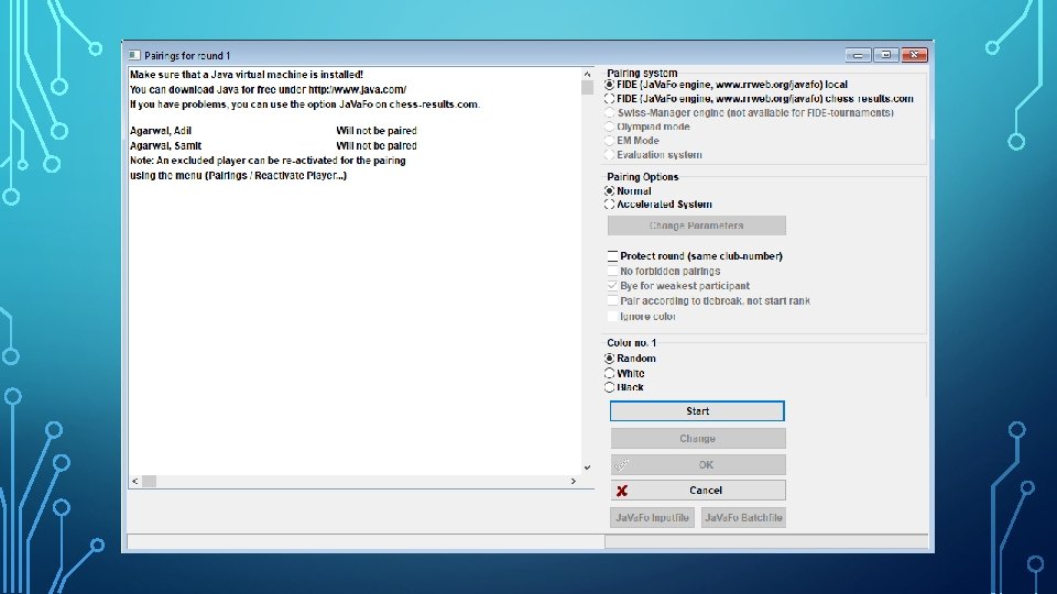 DOING THE PAIRINGS • The left panel shows you who is to be excluded from the pairings • There are two possible pairing systems: Local and Chess-Results. com • Ja. Va. Fo is the name of the pairing engine • If Java is installed on your machine, you can use Local • If Java is not installed on your machine, you can use Chess. Results. com • We will not use Accelerated Pairings for this! • “Colour No. 1” is the colour the first seed has. Normally this would be set to Random, but for this Seminar we will choose white so that we
