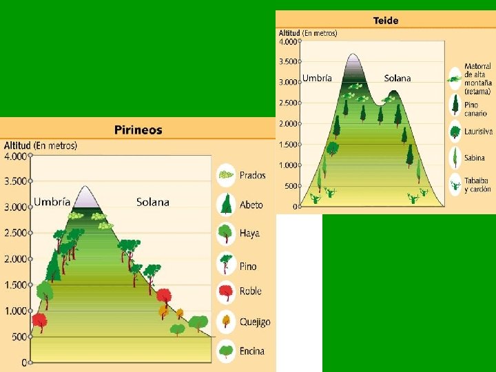 LAS MONTAÑAS. Sierra de Guara • Por encima de los 1000 1500 metros, la altitud y la exposición de las laderas al sol y el viento introducen condiciones especiales para la vegetación. • A medida que el frío y la humedad aumentan con la altitud, y dependiendo de la orientación a la solana o la umbría, las especies vegetales se van sucediendo hacia la cumbre formando escalones de vegetación. Es lo que se denomina una CLISERIE. • En la base de la cliserie siempre aparecen especies de la zona en la que la montaña se ubique.