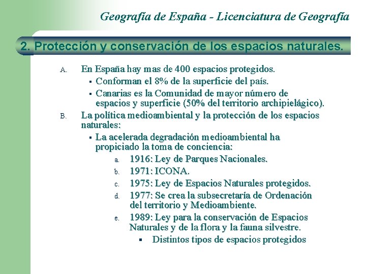 Geografía de España - Licenciatura de Geografía 2. Protección y conservación de los espacios naturales. A. B. En España hay mas de 400 espacios protegidos. § Conforman el 8% de la superficie del país. § Canarias es la Comunidad de mayor número de espacios y superficie (50% del territorio archipielágico). La política medioambiental y la protección de los espacios naturales: § La acelerada degradación medioambiental ha propiciado la toma de conciencia: a. 1916: Ley de Parques Nacionales. b. 1971: ICONA. c. 1975: Ley de Espacios Naturales protegidos. d. 1977: Se crea la subsecretaría de Ordenación del territorio y Medioambiente. e. 1989: Ley para la conservación de Espacios Naturales y de la flora y la fauna silvestre. § Distintos tipos de espacios protegidos