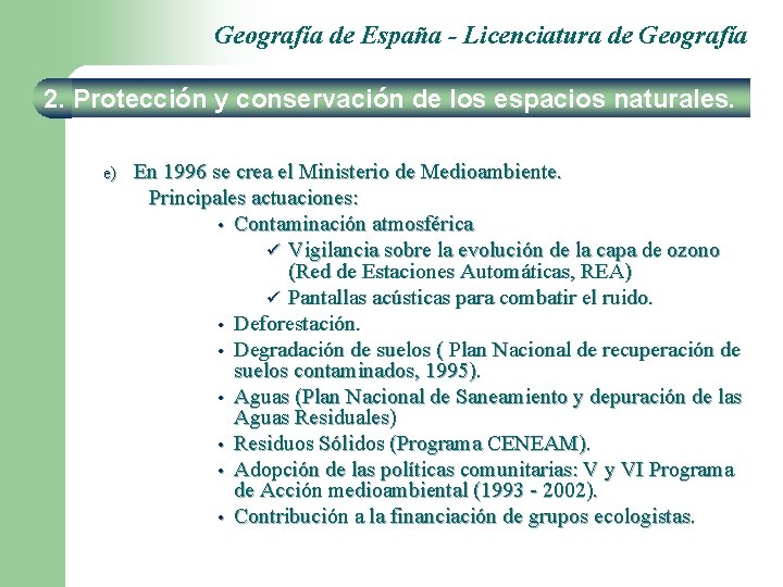 Geografía de España - Licenciatura de Geografía 2. Protección y conservación de los espacios naturales. e) En 1996 se crea el Ministerio de Medioambiente. Principales actuaciones: • Contaminación atmosférica ü Vigilancia sobre la evolución de la capa de ozono (Red de Estaciones Automáticas, REA) ü Pantallas acústicas para combatir el ruido. • Deforestación. • Degradación de suelos ( Plan Nacional de recuperación de suelos contaminados, 1995). • Aguas (Plan Nacional de Saneamiento y depuración de las Aguas Residuales) • Residuos Sólidos (Programa CENEAM). • Adopción de las políticas comunitarias: V y VI Programa de Acción medioambiental (1993 - 2002). • Contribución a la financiación de grupos ecologistas.