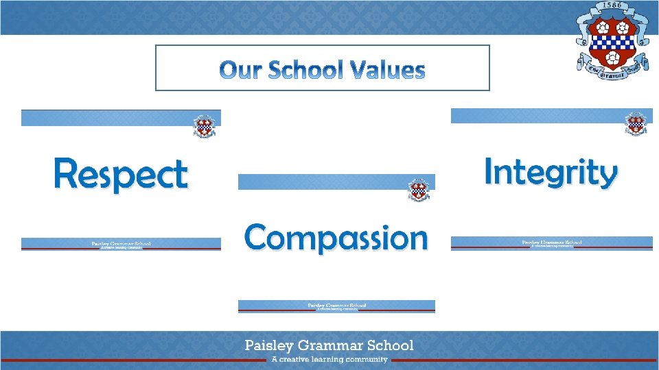 Welcome to our essential guide to starting S 1. We are eagerly awaiting your arrival and are excited to see all of you again soon. In this Power Point you will find lots of information about our school. You might already know some of the information from your visits, however given our current situation it won’t do any harm to remind you. On the following slide you will our school values and these are at the heart of everything we do at Paisley Grammar School.