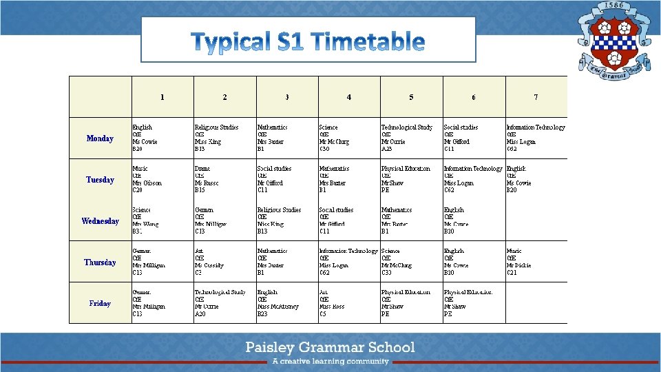 • Paisley Grammar is timetabled on a 33 period a week structure. • This means that over the course of the week pupils will have three ‘late’ days and two ‘short’ days. • The timings and days are indicated here Period Time 1 2 8. 50 – 9. 40 – 10. 30 Interval 10. 30 – 10. 45 3 4 5 Lunch 6 10. 45 – 11. 35 – 12. 25 – 13. 15 – 14. 00 – 14. 50 – 11. 35 12. 25 13. 15 14. 00 14. 50 15. 40 Mon Tue Thu Period Time Wed Fri Interval 10. 30 – 10. 45 7 3 4 Lunch 5 6 10. 45 – 11. 35 – 12. 25 – 13. 15 – 14. 00 – 11. 35 12. 25 13. 15 14. 00 14. 50
