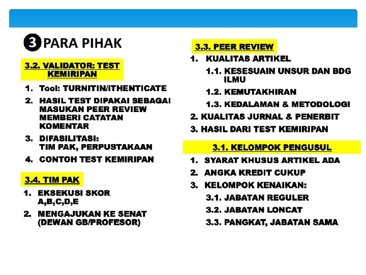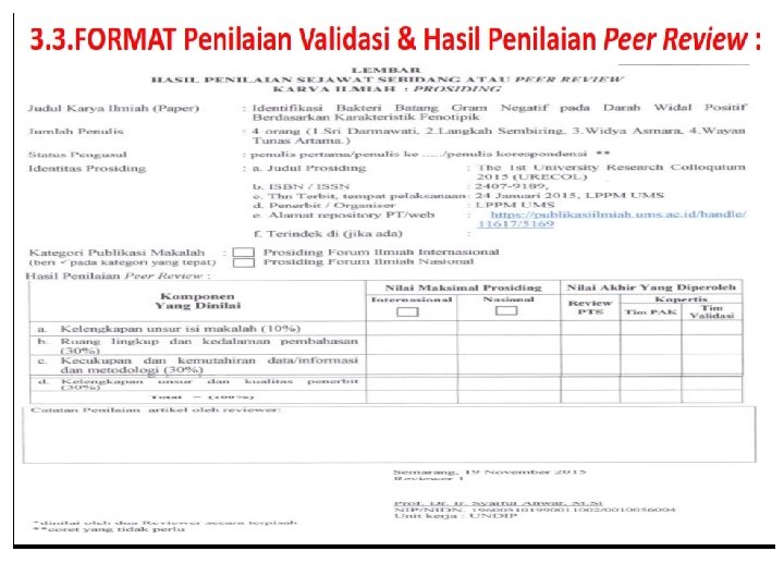 HAL-HAL PENTING DALAM KEGIATAN PENELITIAN DAN PUBLIKASI (UNSUR B) (PAK Dikti 2014) Publikasi pada Jurnal internasional edisi khusus/suplemen atau jurnal ilmiah nasional terakreditasi edisi khusus/suplemen yang memuat artikel yang disajikan dalam sebuah seminar/simposium/lokakarya dapat dinilai sama dengan jurnal edisi normal (bukan edisi khusus) namun tidak dapat digunakan untuk memenuhi syarat publikasi kenaikan jabatan akademik. Perlu ditekankan, edisi khusus/suplemen ini harus diproses seperti pada penerbitan non edisi khusus (terbitan normal) dan memenuhi syarat-syarat karya ilmiah. Lain-lain Proses penilaian jurnal yang hanya mempunyai edisi elektronik disamakan dengan kriteria jurnal yang berlaku (tidak dibedakan). Artikel dalam jurnal nasional yang terindeks oleh DOAJ atau laman lain sesuai dengan pertimbangan tim pakar Dirjen Dikti yang berbahasa INA dinilai maksimal 15 dan yang berbahasa Inggris 20 Jurnal nasional yang tidak memenuhi kriteri jurnal nasional disetarakan dengan publikasi pada proseding yang tidak didiseminasikan pada suatu seminar atau yang lainnya. Jurnal ilmiah yang walaupun ditulis dalam Bahasa Resmi PBB namun tidak memenuhi syarat sebagai jurnal ilmiah internasional, disetarakan dengan jurnal ilmiah nasional tidak terakreditasi.