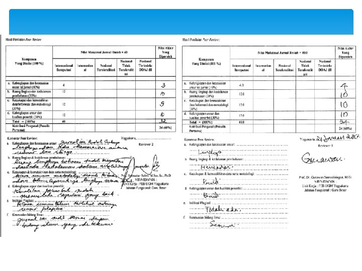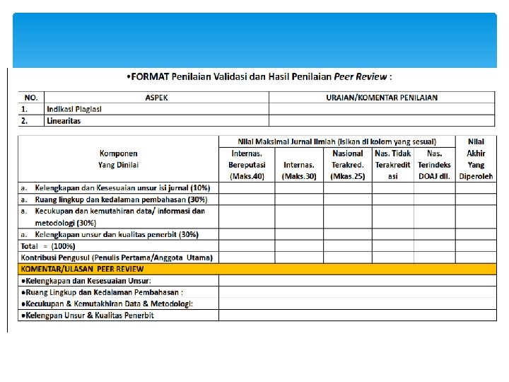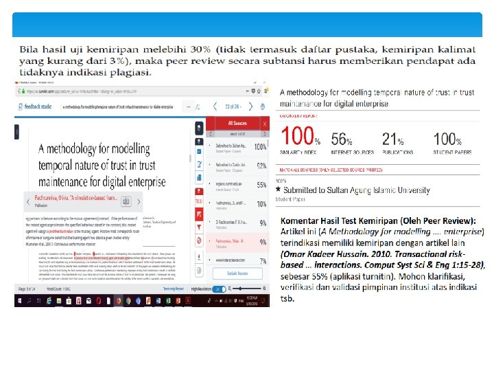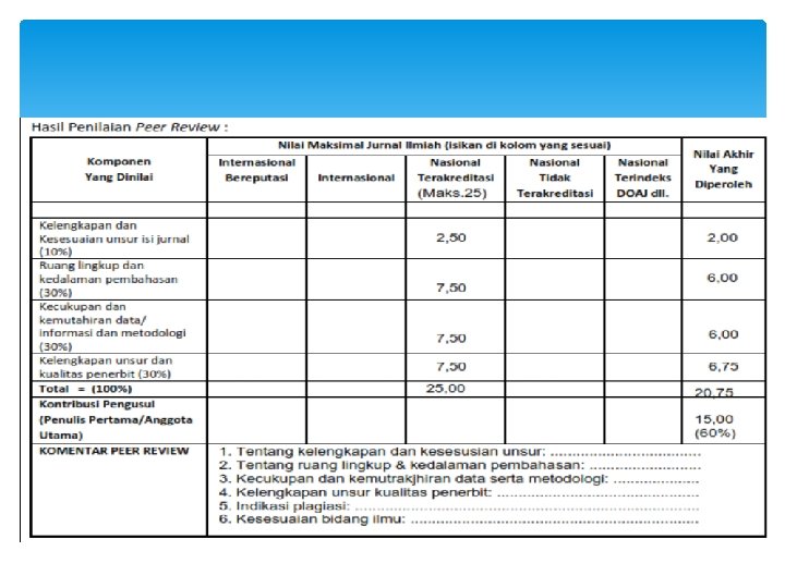 Alasan penolakan Kelengkapan dokumen artikel Kelengkapan URL Jurnal, . . . URL Dokumen, URL Peer Review, URL similarity) Alamat/URL tidak bisa diakses, Isi UR tidak sesuai Kelengkapan peer review (nilai angka + komentar kualitatif) Tidak ada pemeriksaan similarity (Ithenticate atau yg lain) Kelengkapan cek similarity (similarity report , % similarity total & individual) Kualitas Artikel Publisher (yang diragukan transtec, Medwell, Inder. Science) Kelengkapan jurnal (Submitted date, …accepted date) Kualitas tulisan, gambar, pustaka Kriteria jurnal tidak dipenuhi