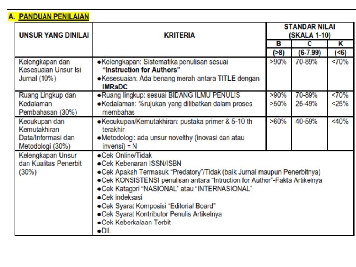 HAL-HAL PENTING DALAM KEGIATAN PENELITIAN DAN PUBLIKASI (UNSUR B) (PAK Dikti 2014) Jurnal nasional adalah majalah ilmiah yang memenuhi kriteria sbb: a. Karya ilmiah ditulis dengan memenuhi kaidah ilmiah dan etika keilmuan b. Memiliki ISSN c. Memiliki terbitan versi online d. Dikelola secara profesional: ketepatan keberkalaan, ketersediaan petunjuk penulisan, identitas jurnal, dll. e. Bertujuan menampung/mengkomunikasikan hasil-hasil penelitian ilmiah dan atau konsep ilmiah dalam disiplin ilmu tertentu f. Ditujukan kepada masyarakat ilmiah/peneliti yang mempunyai disiplin-disiplin keilmuan yang relevan. g. Diterbitkan oleh Penerbit/badan Ilmiah/Organisasi Profesi/Perguruan Tinggi dengan unit-unitnya. h. Bahasa yang digunakan adalah Bahasa Indonesia dan atau Bahasa Inggris dengan abstrak dalam Bahasa Indonesia. i. Memuat karya ilmiah dari penulis yang berasal dari minimal dua institusi yang berbeda j. Mempunyai dewan redaksi/editor yang terdiri dari para ahli dalam bidangnya dan berasal dari minimal dua institusi yang berbeda k. Jurnal nasional yang memenuhi kriteria a sampai j dan terindek oleh DOAJ atau laman lain sesuai dengan pertimbangan tim pakar Dirjen Dikti diberi nilai yang lebih tinggi dari jurnal nasional yaitu maksimal 15.