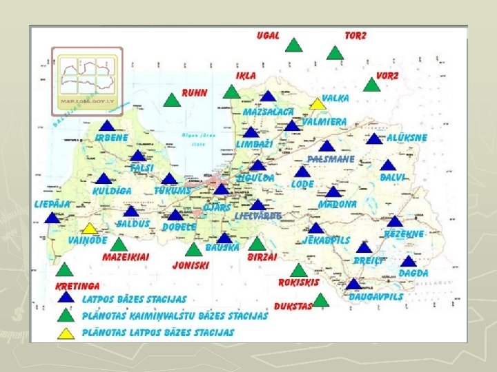 GPS bāzes staciju sistēmas Lat. Pos (Latvijas Pozicionēšanas sistēma) pakalpojumi GPS bāzes staciju sistēma sastāv no 24 bāzes stacijām jeb GPS uztvērējiem, kas darbojas nepārtrauktā režīmā (365 dienas gadā), uzkrājot uztvertos (signālu) datus un izplatot tos lietotājiem; ► GPS bāzes stacija nodrošina iespēju lietotāja GPS uztvērējam noteikt koordinātas ar divu centimetru precizitāti reālajā laikā un ar piecu milimetru precizitāti, izmantojot uzkrātos datus. Pieejami arī dati ilgākam laika periodam, kas ir izmantojami zinātniskiem mērķiem; ► GPS bāzes staciju koordinātas aprēķinātas Latvijas koordinātu sistēmā LKS-92 TM un sasaistītas ar Valsts ģeodēzisko tīklu; ► Vairāk informācijas par Lat. Pos pakalpojumiem var saņemt, rakstot uz e-pastu latpos@lgia. gov. lv. ►