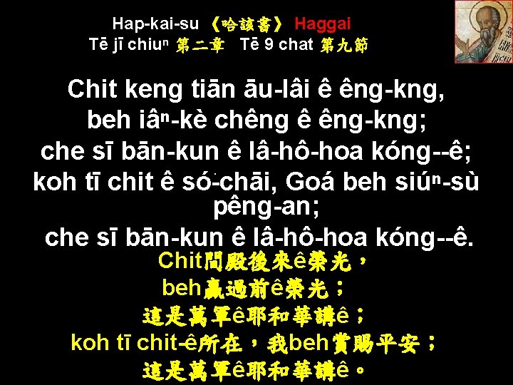 Hap-kai-su 《哈該書》 Haggai Tē jī chiuⁿ 第二章 Tē 7 chat 第七節 Goá beh tín-tāng bān-kok, bān-kok só him-bō --ê beh lâi; Goá chiū hō êng-kng chhiong-moá chit keng tiān; che sī bān-kun ê Iâ-hô-hoa kóng--ê. 我beh振動萬國, 萬國所欣慕ê beh來; 我就hō 榮光 充滿chit間殿; 這是萬軍ê耶和華講ê。