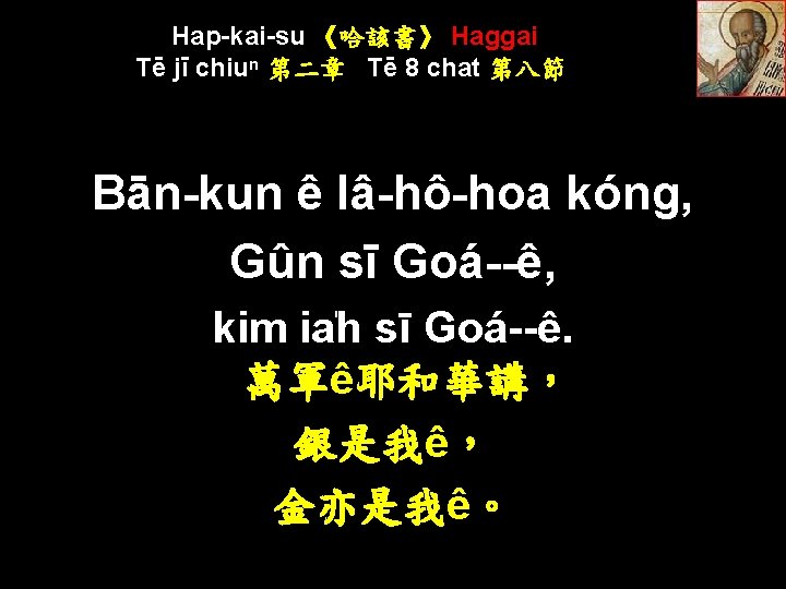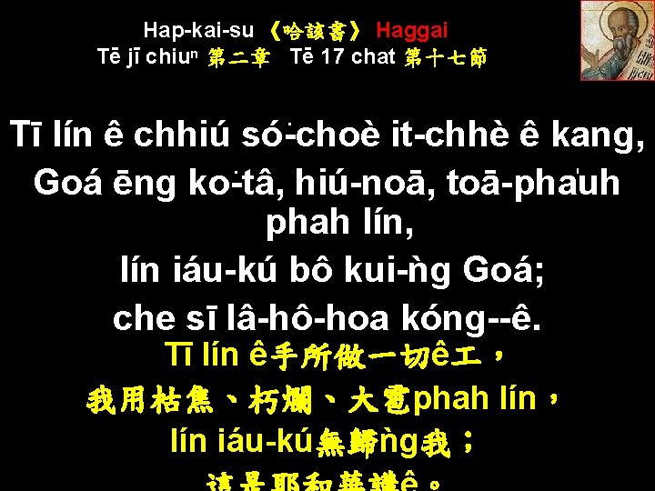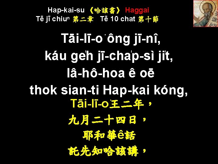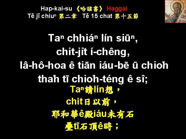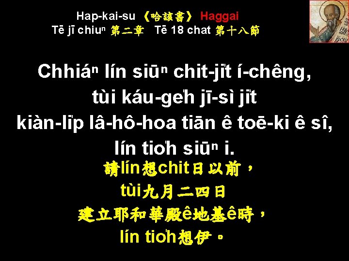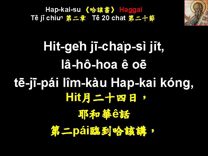 Hap-kai-su 《哈該書》 Haggai Tē jī chiuⁿ 第二章 Tē 1 chat 第一節 Chhit-ge h jī-cha p-it ji t, Iâ-hô-hoa ê oē thok sian-ti Hap-kai kóng, 七月二十一日, 耶和華ê話 託先知哈該 講,