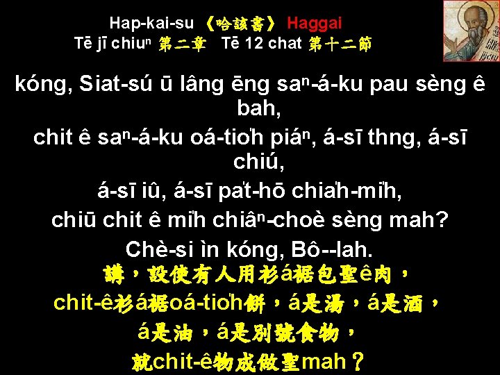 Hap-kai-su 《哈該書》 Haggai Tē jī chiuⁿ 第二章 Tē 11 chat 第十一節 Bān-kun ê Iâ-hô-hoa án-ni kóng, Koan-hē tī lu t-hoat lí thang mn g chè-si, 萬軍ê耶和華án-ni講, 關係tī律法 你thang問祭司,