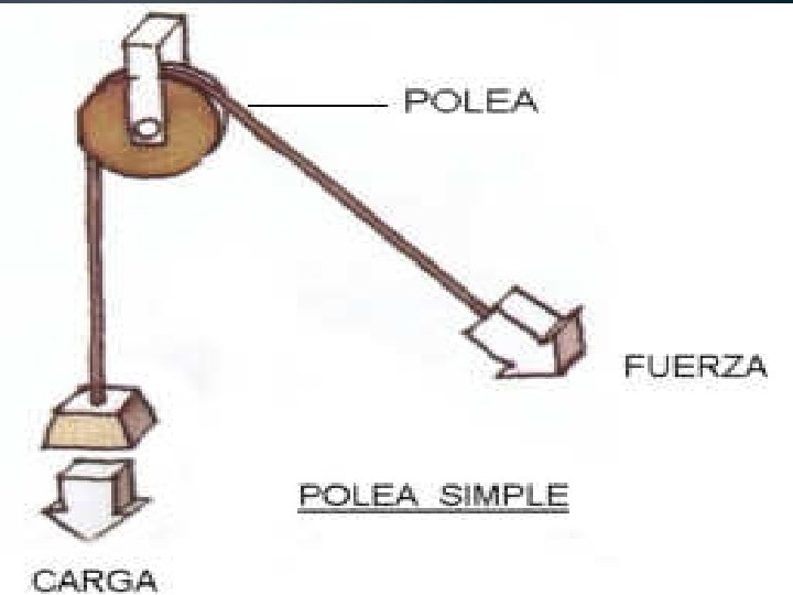POLEAS • Una polea, es una máquina simple, un dispositivo mecánico de tracción, que sirve para transmitir una fuerza. Además, formando conjuntos aparejos o polipasto sirve para reducir la magnitud de la fuerza necesaria para mover un peso. • Según definición de Hatón de la Goupillière, «la polea es el punto de apoyo de una cuerda que moviéndose se arrolla sobre ella sin dar una vuelta completa» 1 actuando en uno de sus extremos la resistencia y en otro la potencia.