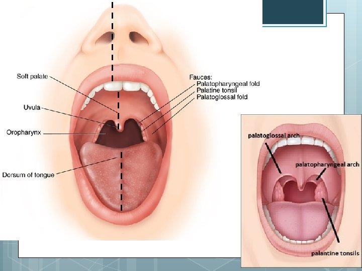 Palate Hard palate – anterior portion of mouth’s roof; formed by maxillae and palatine bones Soft palate – posterior portion of mouth's roof; formed by two muscular arches: Palatoglossal arch - extends from palate to tongue anterior to palatine tonsils Palatopharyngeal arch - extends from palate to pharyngeal wall posterior to palatine tonsil