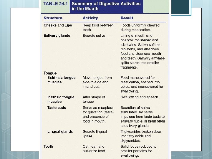 Composition and Functions of Saliva Composition: 1. 2. 99. 5% water 0. 5% solutes (salts, gases, mucous, ions, enzymes, lysozyme, Ig. A) Functions: 1. 2. 3. 4. 5. 6. 7. Lubricate food for easier swallowing Dissolve food for tasting Moistens mucous membranes Bicarbonate ions buffer acidic foods Salivary amylase begins chemical digestion of starch (maltose) Lysozyme antibacterial Ig. A 1 st line of defense