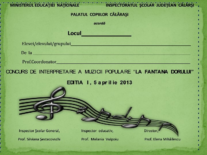 INVITATIE PALATUL COPIILOR CĂLĂRAŞI � Va invita la prima editie a Concursului de interpretare a muzicii populare “LA F NTANA DORULUI”, CĂLĂRAŞI 2013 � Concursul va avea loc pe data de 5 aprilie 2013 la Palatul Copiilor Calarasi; � Va invitam sa participati la acest concurs conform regulamentului si fisei de inscriere alaturate; � Termenul limita de inscriere este de 1 aprilie 2013; � Fisele de inscriere vor putea fi trimise prin fax la numarul -0242 /314 818 , sau depuse personal la sediul Palatului Copiilor din str. Baraganului , Nr. 26 , Calarasi; � Va asteptam cu drag ! Director, Mihailescu Elena