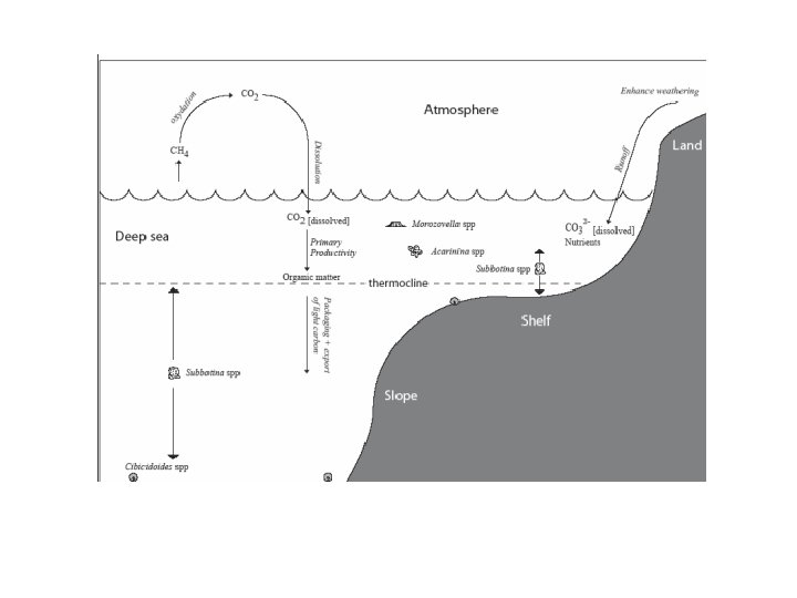 SONUÇLAR • PETM - Paleosen-Eosen Termal Maksimum • • 56 m. y. önce, CO 2'nin yeniden dengelenmesi için gereken süre 150 k. y. sürdü. • • Erken Eosen'de 20 ky boyunca büyük karbon salımı (> 4 trilyon ton). Kaynak bilinmiyor. . Bu olaylar bilinen karbon izotop kalıplarıyla belgelenmiştir • Okyanuslar, okyanus tortullarında planktonik kabukların yokluğu ile gösterildiği gibi asitleşmiştir. • • Okyanuslar 5 o. C veya 9 o. F'ye kadar ısıtılır. Hava sıcaklığı daha da yüksekti.