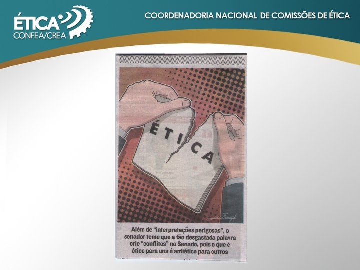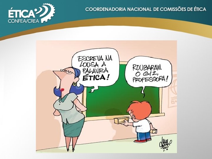 ENQUADRAMENTO RESOLUÇÃO Nº 1002/2002 - CONFEA Art. 8º A prática da profissão é fundada nos seguintes princípios éticos aos quais o profissional deve pautar sua conduta: Do objetivo da profissão : I - A profissão é bem social da humanidade e o profissional é o agente capaz de exercê-la, tendo como objetivos maiores a preservação e o desenvolvimento harmônico do ser humano, de seu ambiente e de seus valores; Da natureza da profissão: II - A profissão é bem cultural da humanidade construído permanentemente pelos conhecimentos técnicos e científicos e pela criação artística, manifestando-se pela prática tecnológica, colocado a serviço da melhoria da qualidade de vida do homem; Da honradez da profissão : III - A profissão é alto título de honra e sua prática exige conduta honesta, digna e cidadã; Da eficácia profissional : IV - A profissão realiza-se pelo cumprimento responsável e competente dos compromissos profissionais, munindo-se de técnicas adequadas, assegurando os resultados propostos e a qualidade satisfatória nos serviços e produtos e observando a segurança nos seus procedimentos;