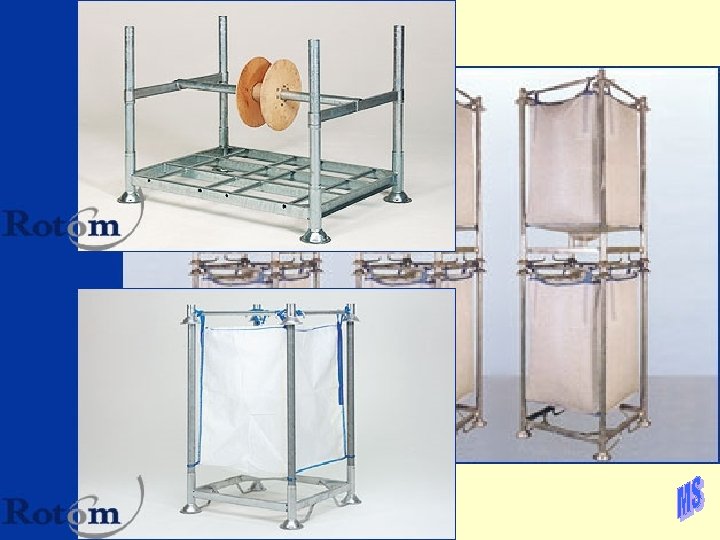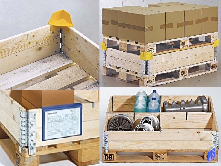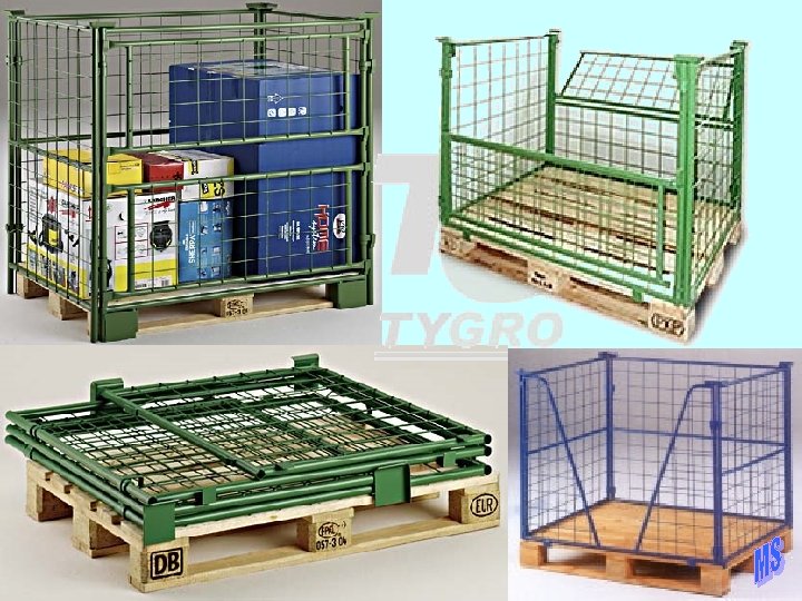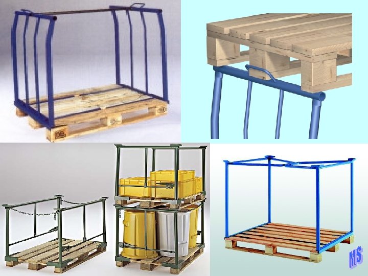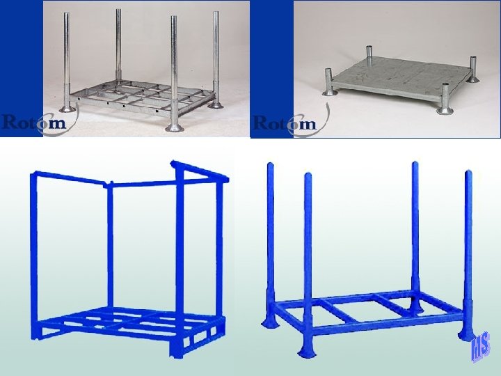 Palety słupkowe • Są to urządzenia wielokrotnego użytku, posiadające słupki umożliwiające piętrzenie paletowych jednostek ładunkowych bez obciążania ładunku znajdującego się na palecie