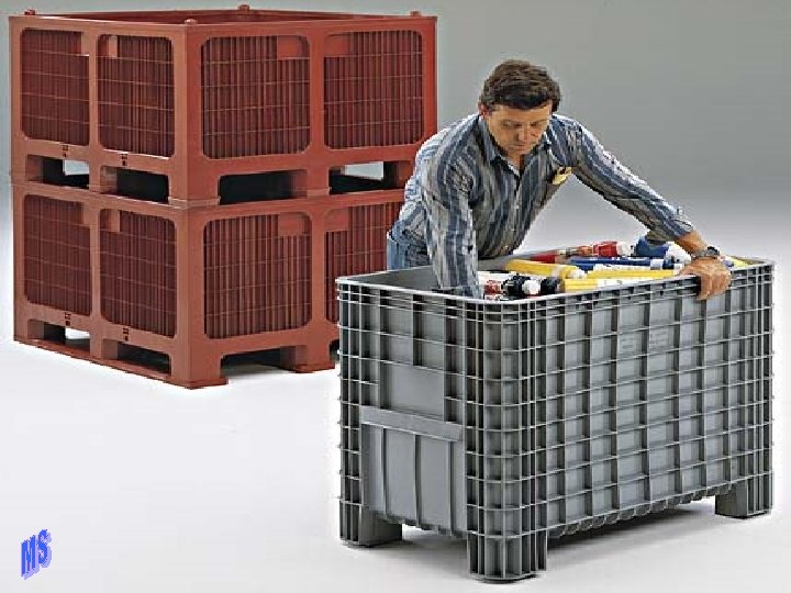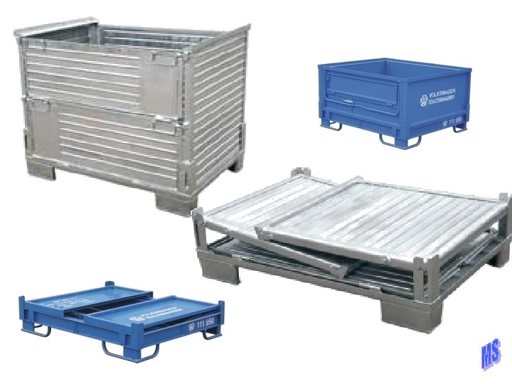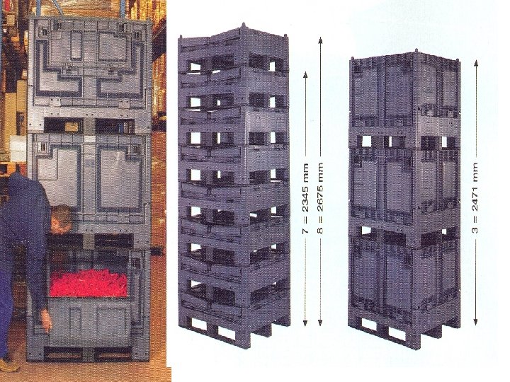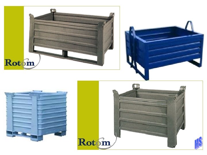 Palety skrzyniowe • Są to urządzenia wielokrotnego użytku, posiadające ścianki i umożliwiające piętrzenie i składowanie w nich ładunków o nieregularnych kształtach i różnych wymiarach, luzem i w opakowaniach • Mogą być wykonane z metalu, tworzywa sztucznego lub metalu i drewna • Rozróżniamy palety skrzyniowe : v Pełne – posiadają ścianki boczne trwale i sztywno połączone z płytą nośną