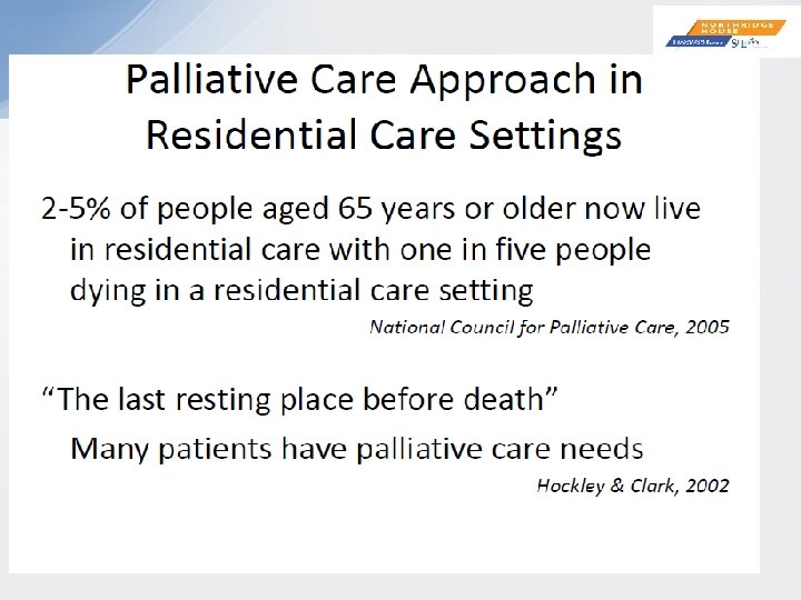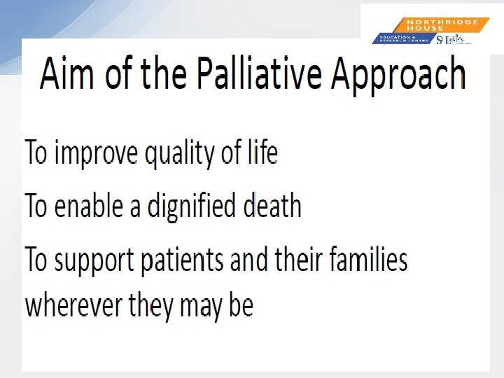 A core skill in health and social care and focuses on: § Promoting quality of life § Providing effective symptom control § Holistic approach that includes the person’s life experience and current situation § Care for the dying person and those who matter to the person § Open sensitive communication with the person, family/carers and colleagues