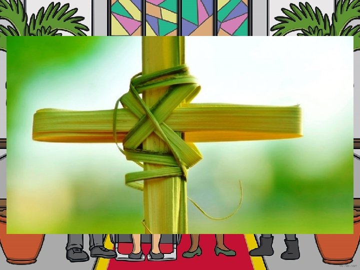 The Sunday before Easter is known as Palm. Sunday. It celebrates Jesus' arrival in Jerusalem for the Jewish festival of Passover. Great crowds of people lined the streets waving palm branches to welcome him. The people were very excited. They spread branches on the road – and even laid down their clothes. They shouted 'Hosanna!' which means 'Save us Now!’ We wave our UK flags at parades. They waved palm branches.