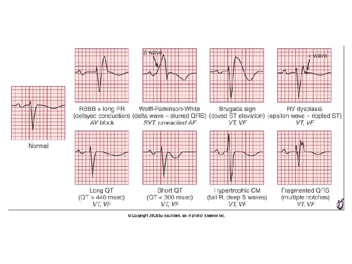 ECG • • • 1 - QT (long QT , short QT) 2 - burgada syndrome 3 - WPW 4 - ARVD ( epsilon wave) 5 - HCM 6 - MI