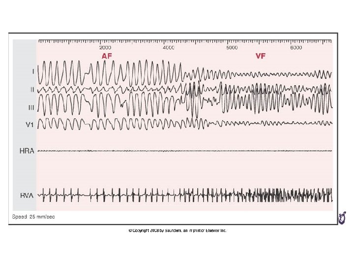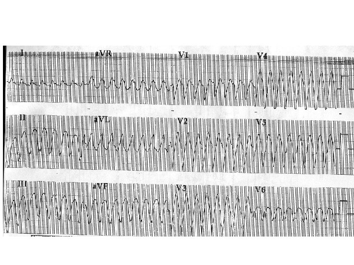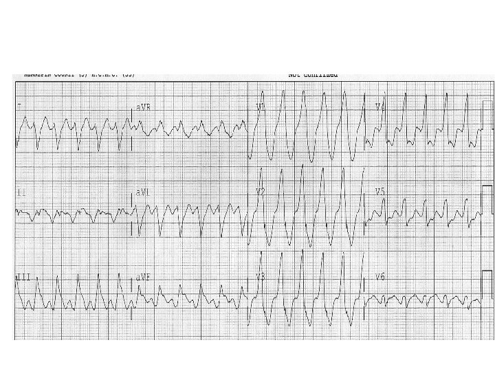 Ventricular Fibrillation (VF) • Totally chaotic rapid ventricular rhythm • Often precipitated by VT • Fatal unless promptly terminated (DC shock)